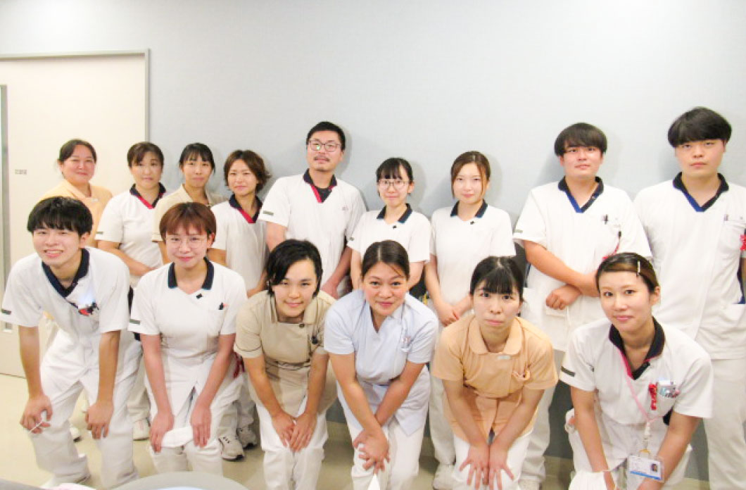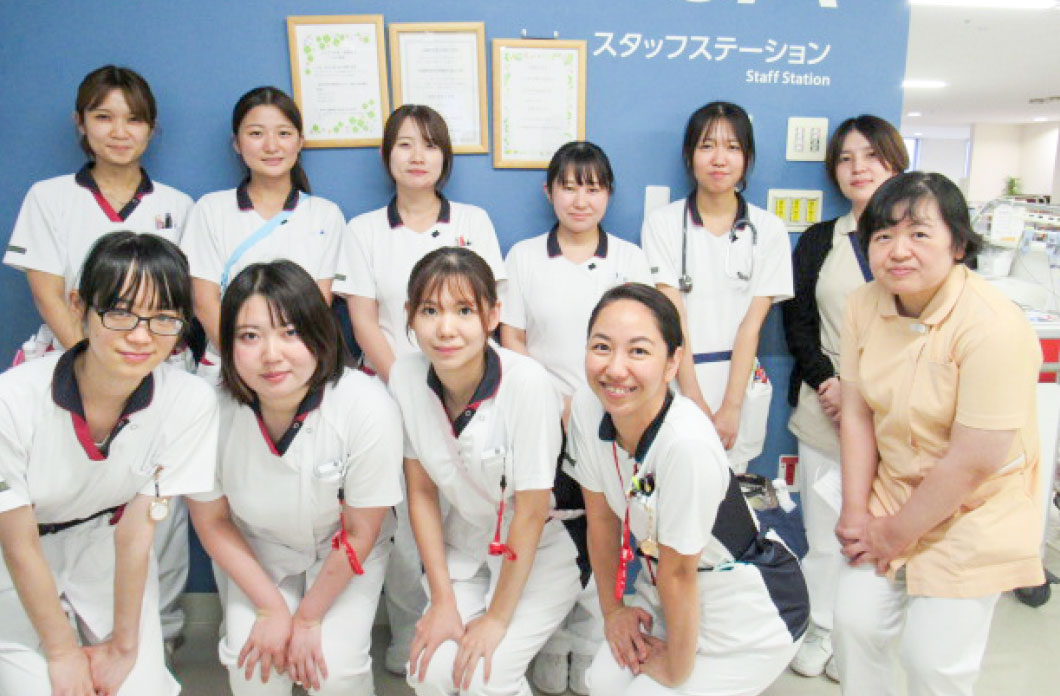 2A病棟は、55床の循環器内科・総合内科の混合病棟です。主な疾患は心筋梗塞・心不全・誤嚥性肺炎・脳梗塞などで、急性期から回復期、終末期まで幅広く、病棟内には心臓リハビリテーションを併設。また、同フロアに循環器外来・カテーテル室も隣接し、カテーテル検査には病棟看護師が兼任で業務にあたっています。外来から入院、カテーテル検査・治療、リハビリと患者さまの一連の経過に関わり、循環器看護を深めていくことができます。スタッフ同士は仲が良く、明るい環境で元気にみんなで頑張っています。